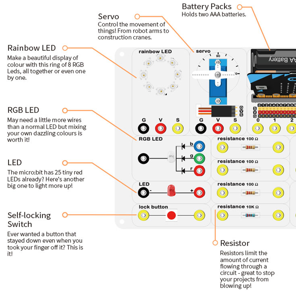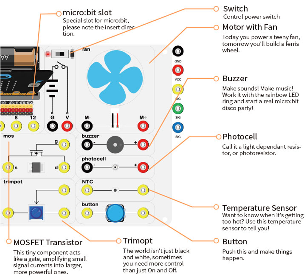 Es una caja multifunción basada en equipos experimentales profesionales. Esta caja es una nueva ayuda para la enseñanza desarrollada por ELECFREAKS. Incluye componentes tradicionales como sensor de temperatura, fotocelda, servo, motor y LED. Pero también contiene componentes electrónicos como el transistor MOSFET, diferentes valores de resistencias y un trimpot para combinar el diseño del circuito con la programación.